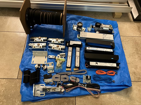 既設の自動扉設備(駆動装置・制御盤・センサー・建具等)を新しい部品へ交換する工事です。